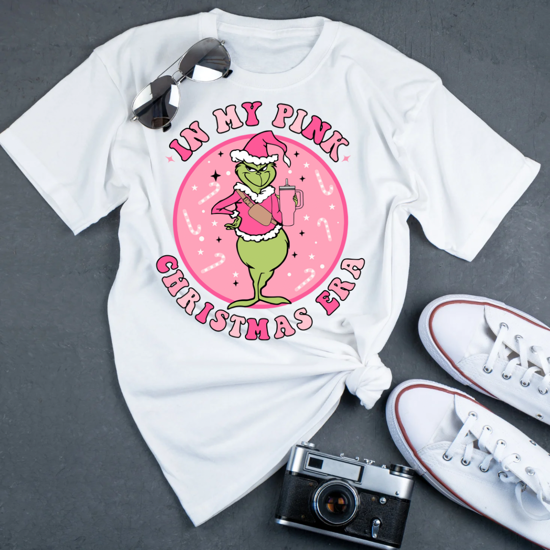 Introducing In My Pink Christmas Era, a high-quality tee perfect for mommy and me outfits during the holiday season! Made with a festive pink color and featuring the beloved Grinch, this shirt is sure to be a hit at all your Christmas festivities. Upgrade your style game and spread holiday cheer with this must-have tee.